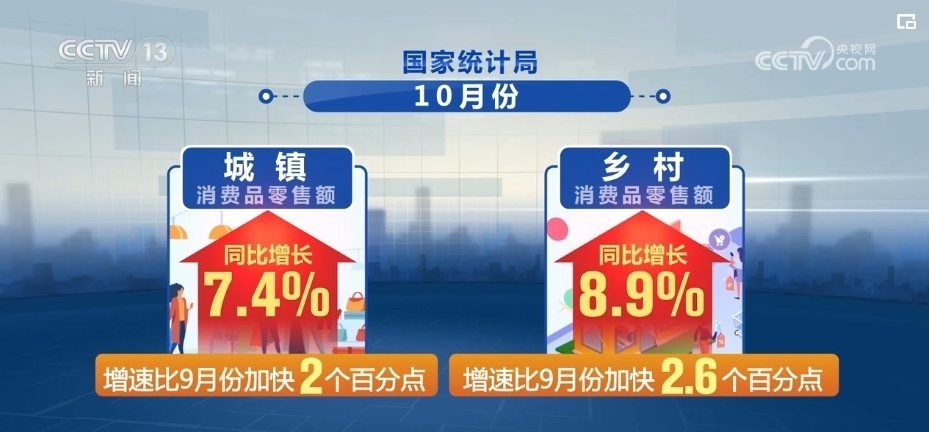國家統(tǒng)計(jì)局最新數(shù)據(jù)顯示,在縣鄉(xiāng)消費(fèi)市場基礎(chǔ)設(shè)施不斷完善、有效供給持續(xù)擴(kuò)大等有利條件帶動下,鄉(xiāng)村市場銷售增速快于城鎮(zhèn)。10月份,城鎮(zhèn)、鄉(xiāng)村消費(fèi)品零售額同比分別增長7.4%和8.9%,增速比9月份分別加快2和2.6個(gè)百分點(diǎn)。