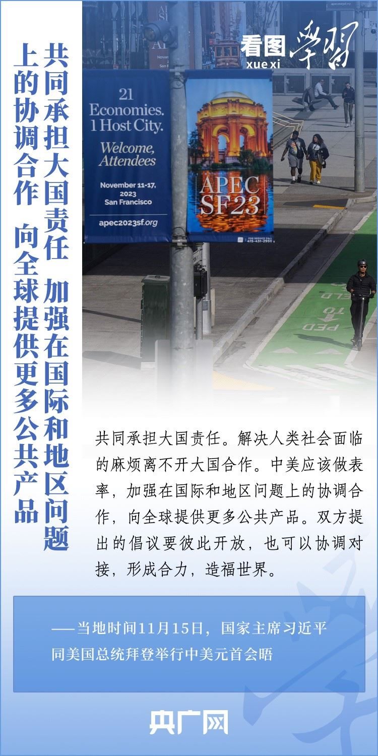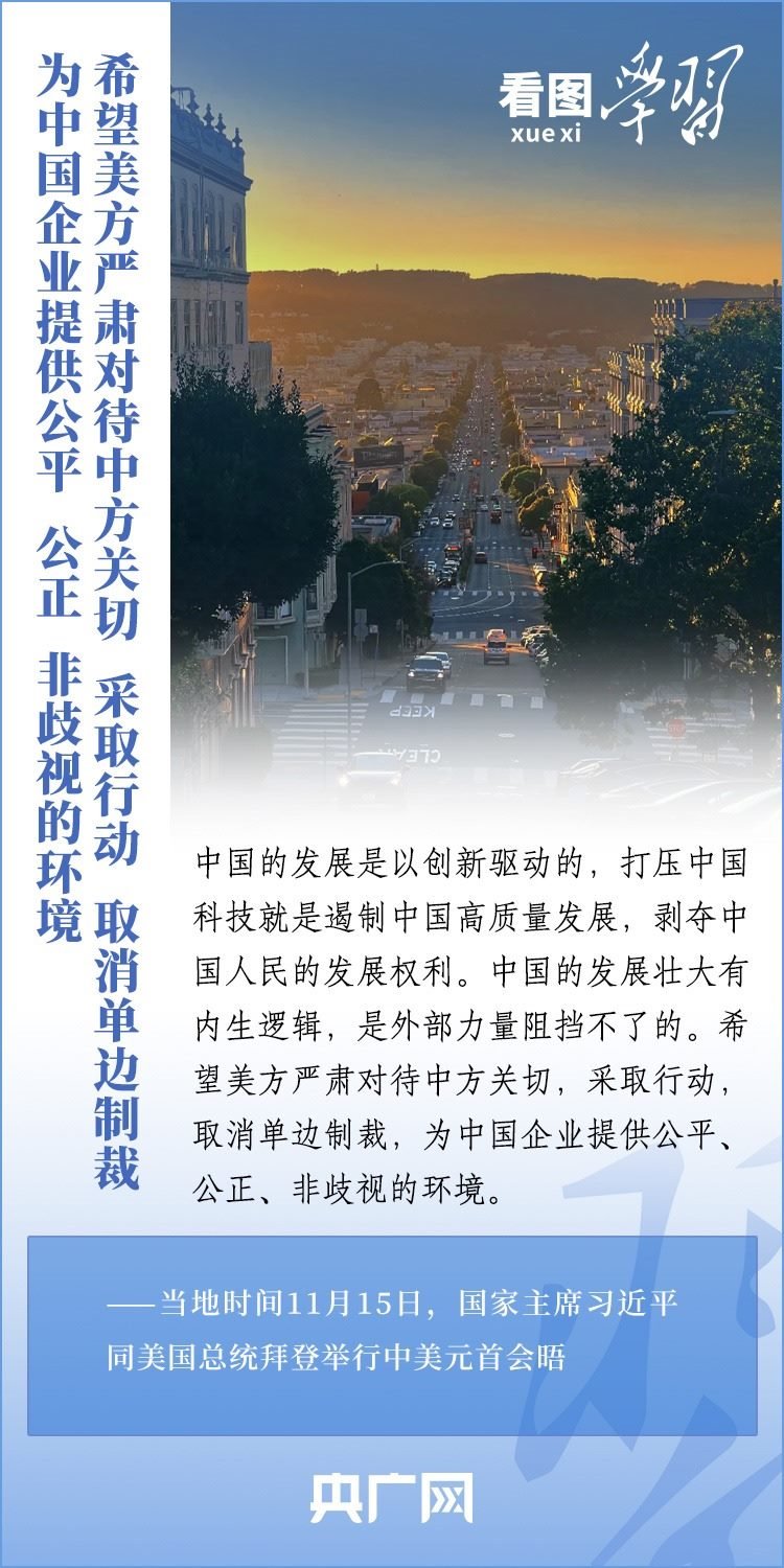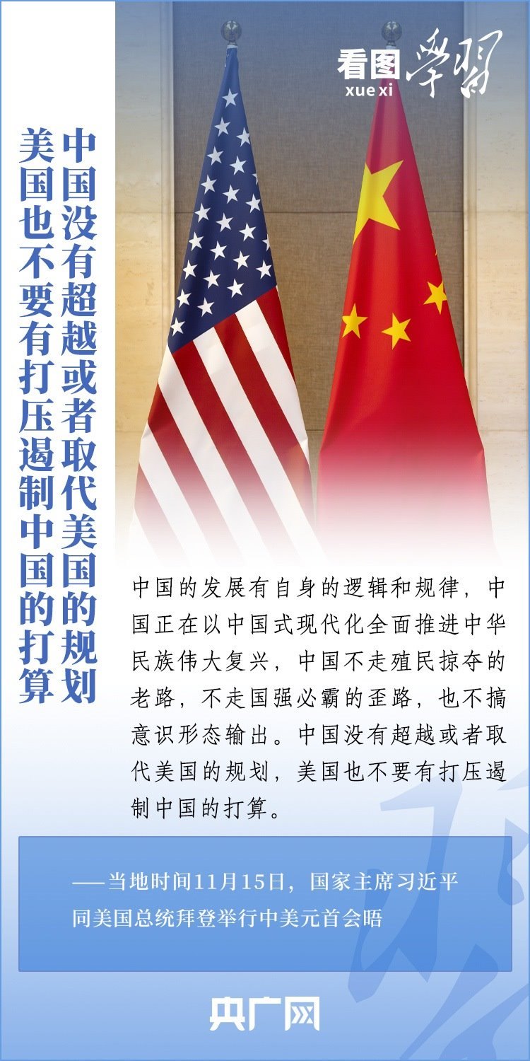 當?shù)貢r間11月15日,國家主席習近平在美國舊金山斐洛里莊園同美國總統(tǒng)拜登舉行中美元首會晤。兩國元首就事關(guān)中美關(guān)系的戰(zhàn)略性、全局性、方向性問題以及事關(guān)世界和平和發(fā)展的重大問題坦誠深入地交換了意見。習近平主席指出,大國競爭解決不了中美兩國和世界面臨的問題。這個地球容得下中美兩國。中美各自的成功是彼此的機遇。一起來學習!
