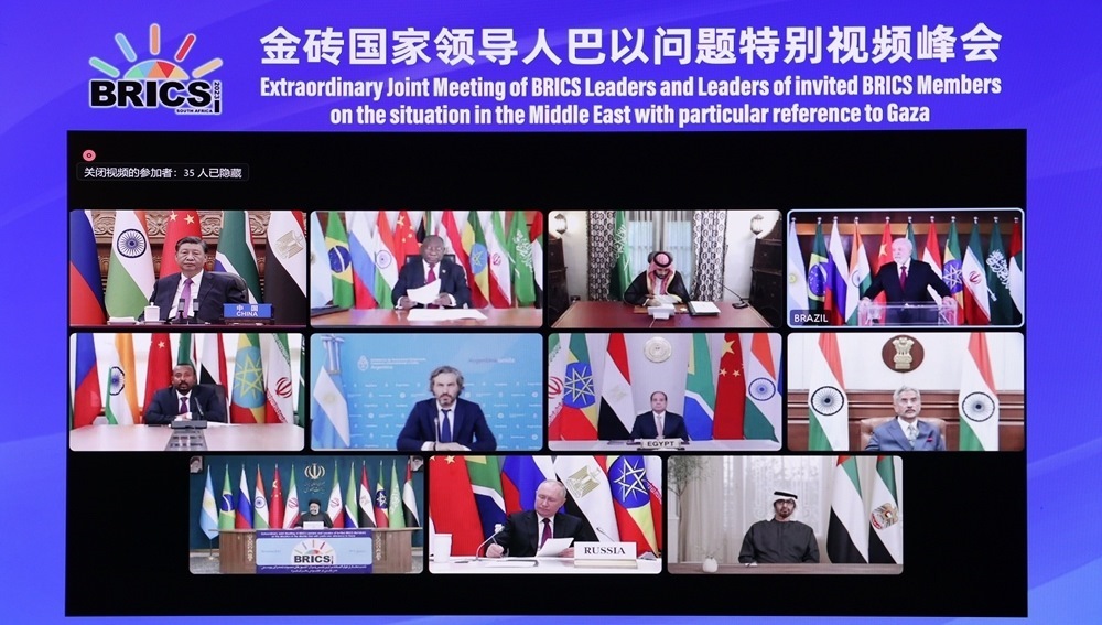 “當(dāng)前形勢下,金磚國家就巴以問題發(fā)出正義之聲、和平之聲,非常及時、非常必要?!痹谥v話中,習(xí)近平主席開宗明義。