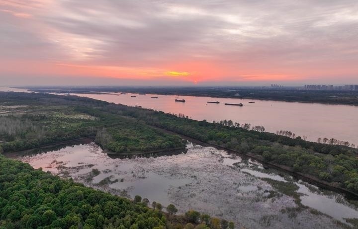 長(zhǎng)江新濟(jì)洲日落時(shí)分景色(11月13日攝,無(wú)人機(jī)照片)。記者 季春鵬 攝