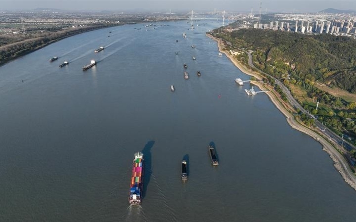 船只行駛在長(zhǎng)江南京段(11月2日攝,無(wú)人機(jī)照片)。記者 季春鵬 攝