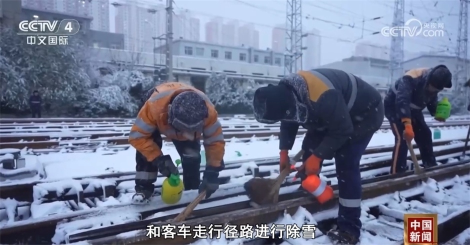 國鐵濟南局濟南工務段濟南線路車間工長 張鑫:著重對道岔的轉折部位和客車走行徑路進行除雪,清掃積雪后立即噴灑防凍液,確保道岔正常運轉不結冰。