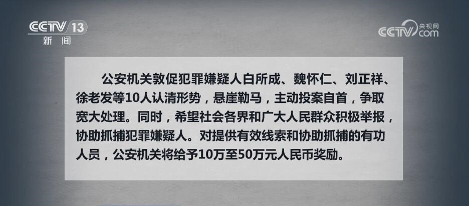 公安機(jī)關(guān)敦促犯罪嫌疑人白所成、魏懷仁、劉正祥、徐老發(fā)等10人認(rèn)清形勢,懸崖勒馬,主動投案自首,爭取寬大處理。同時,希望社會各界和廣大人民群眾積極舉報,協(xié)助抓捕犯罪嫌疑人。對提供有效線索和協(xié)助抓捕的有功人員,公安機(jī)關(guān)將給予10萬至50萬元人民幣獎勵。