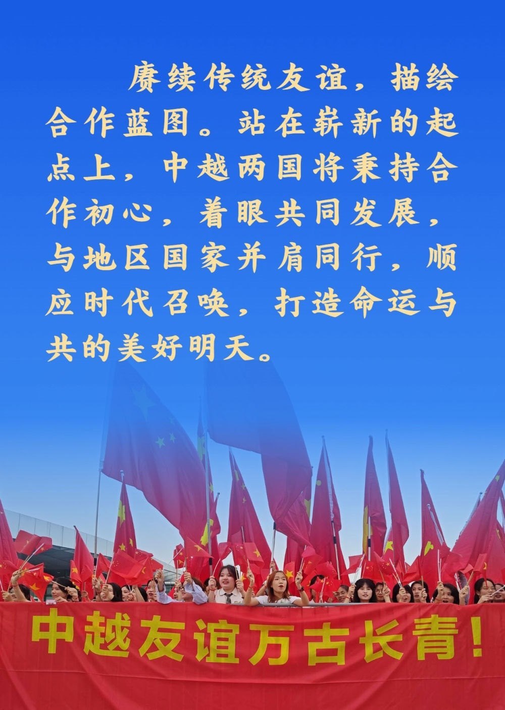 兩位總書記都認為,中越作為友好近鄰,理想相同,理念相通。作為好鄰居、好伙伴、好兄弟、好同志,中越構建具有戰(zhàn)略意義的命運共同體具有天時、地利、人和的獨特優(yōu)勢。雙方應該繼承老一輩領導人締結的傳統(tǒng)友誼,共同努力構建命運共同體,走好各自的現(xiàn)代化道路,實現(xiàn)互利共贏、美美與共,造福兩國人民,也為地區(qū)和平與繁榮作出積極貢獻。