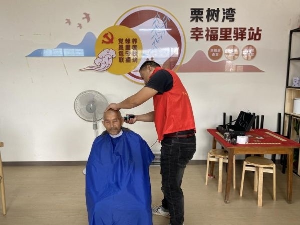 荊門市東寶區(qū)栗溪鎮(zhèn)栗樹灣村留守老人在“養(yǎng)老服務(wù)驛站”享受免費(fèi)理發(fā)服務(wù)