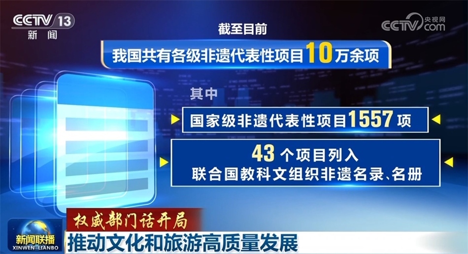 繁榮發(fā)展文化事業(yè)和文化產(chǎn)業(yè),推進(jìn)城鄉(xiāng)公共文化服務(wù)體系提質(zhì)增效。今年前11個(gè)月,文化和旅游部主辦27項(xiàng)展演展示活動(dòng),線下觀眾90萬人次,線上觀看量超過18億次,一批彰顯中華審美風(fēng)范、富有鮮明時(shí)代氣息的舞臺(tái)藝術(shù)作品廣受好評(píng)。保護(hù)傳承弘揚(yáng)中華優(yōu)秀傳統(tǒng)文化,中華文明探源工程、考古中國等重大項(xiàng)目得以深入實(shí)施,截至目前,我國共有各級(jí)非遺代表性項(xiàng)目10萬余項(xiàng),其中國家級(jí)非遺代表性項(xiàng)目1557項(xiàng),43個(gè)項(xiàng)目列入聯(lián)合國教科文組織非遺名錄(名冊(cè)),中國世界遺產(chǎn)數(shù)量增至57項(xiàng)。