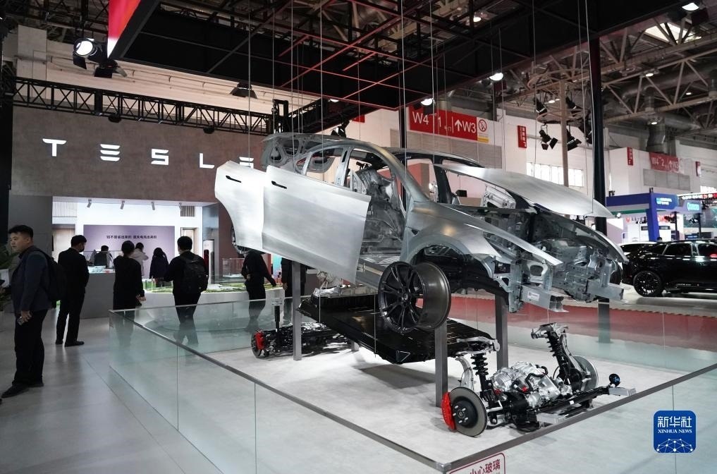 這是首屆中國(guó)國(guó)際供應(yīng)鏈促進(jìn)博覽會(huì)智能汽車(chē)鏈展區(qū)的特斯拉展位(2023年11月30日攝)。新華社記者 任超 攝