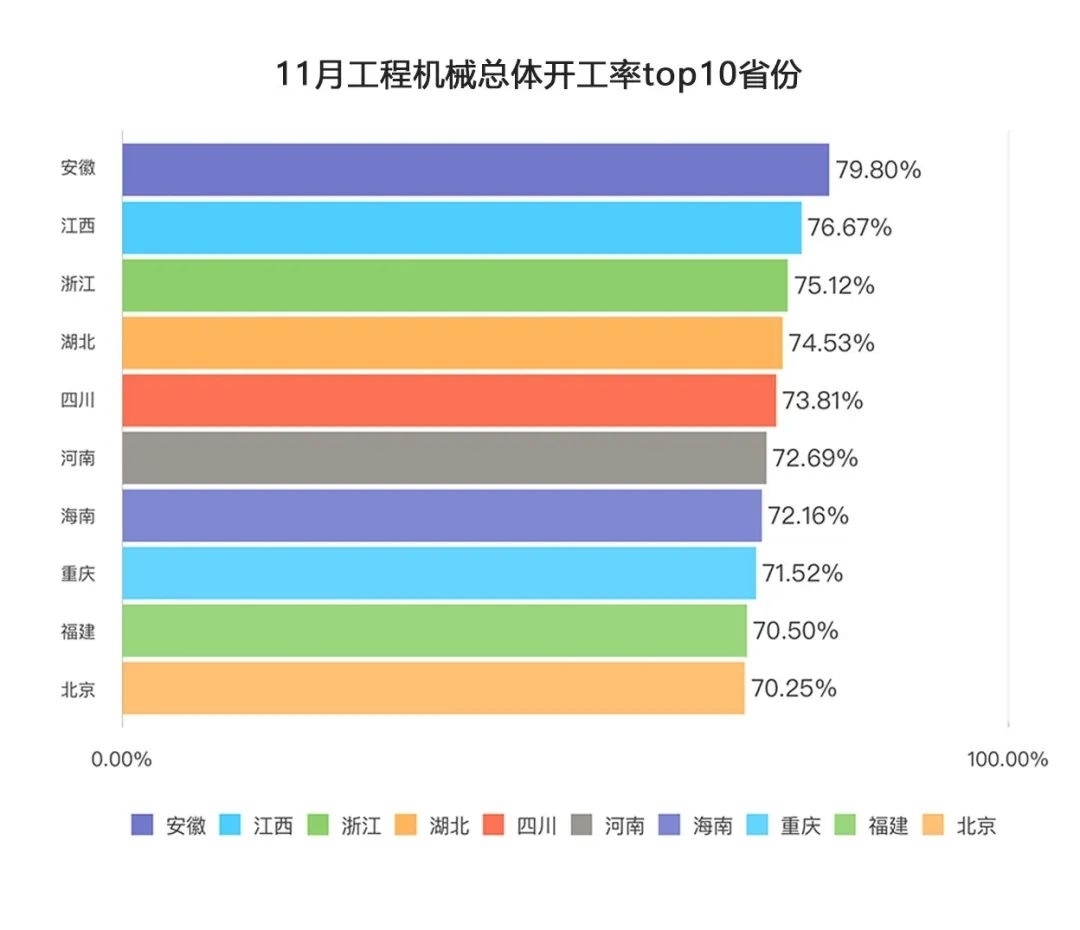 11月,安徽、河南、湖北各有7類設備平均作業(yè)量同比增長,江西有3類設備平均作業(yè)量同比增長,主要集中在汽車起重機、履帶起重機、挖掘機。