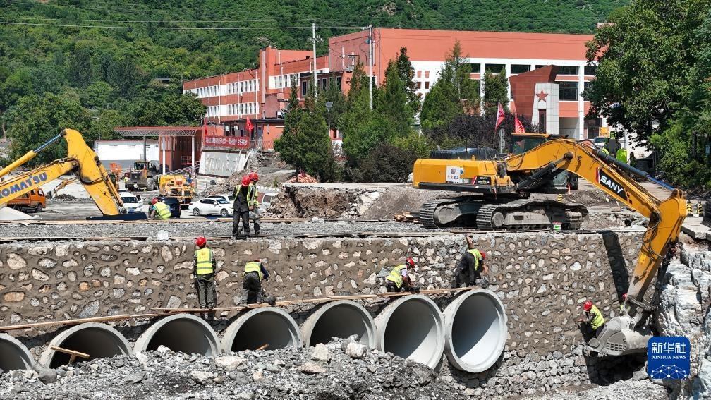 在北京市房山區(qū)霞云嶺中心小學,北京建工機施集團的施工人員在搶建供學校與外界通行的新橋梁(2023年8月23日攝,無人機照片)。新華社記者 鞠煥宗 攝