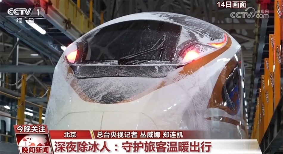 持續(xù)的雨雪冰凍天氣不僅影響公路安全,也對(duì)高鐵動(dòng)車運(yùn)行造成一定影響。晚上11點(diǎn),在北京西和雄安站間運(yùn)行一天的C2727次列車完成任務(wù),入庫(kù)檢修,車頭上頂著厚厚的冰塊。