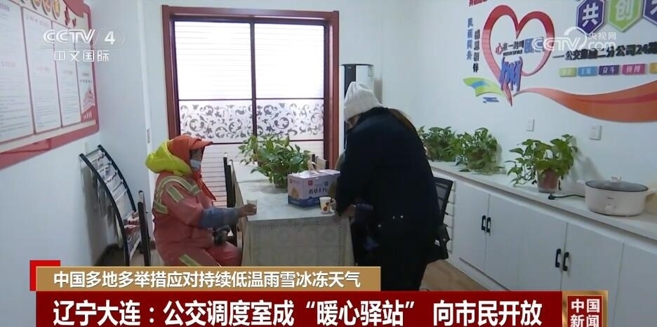 在遼寧大連,嚴(yán)寒天氣下,一些臨近居民區(qū)、菜市場(chǎng)、商業(yè)區(qū)的公交調(diào)度室臨時(shí)向市民開放,供路過(guò)市民歇腳、暖身。