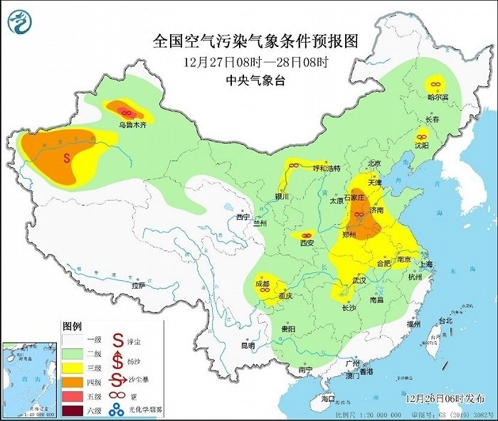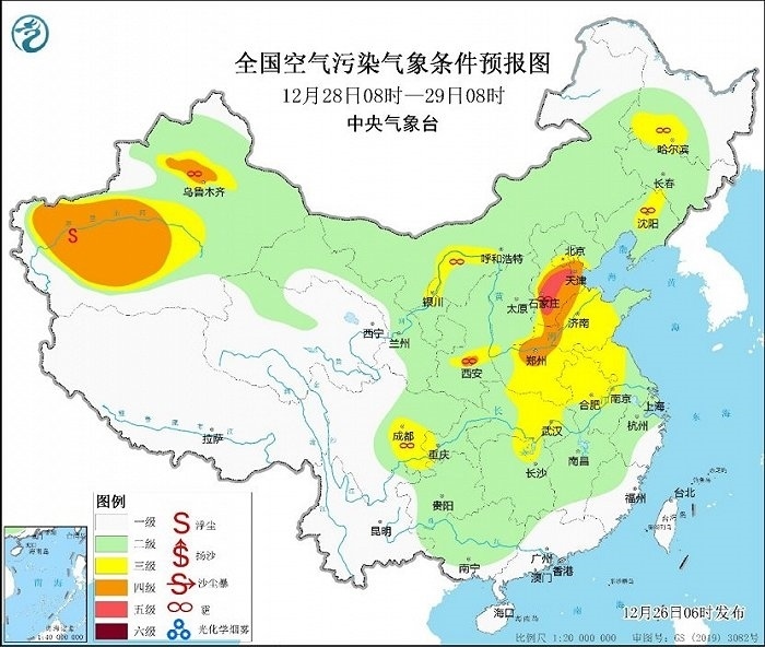 冷空氣勢力弱,霧和霾天氣又要登場。今天,華北、黃淮等地有輕度霾,局地中度或重度霾,27日華北中南部大氣擴散條件將有所改善。28日至30日,華北中南部、黃淮中西部、汾渭平原等地大氣擴散條件再次轉差,將有輕至中度霾,部分地區(qū)重度霾。此外,28日至30日的夜間至上午時段,華北中南部、黃淮、江淮東部、江漢、四川盆地等地的部分地區(qū)有大霧,局地有能見度不足200米的強濃霧。