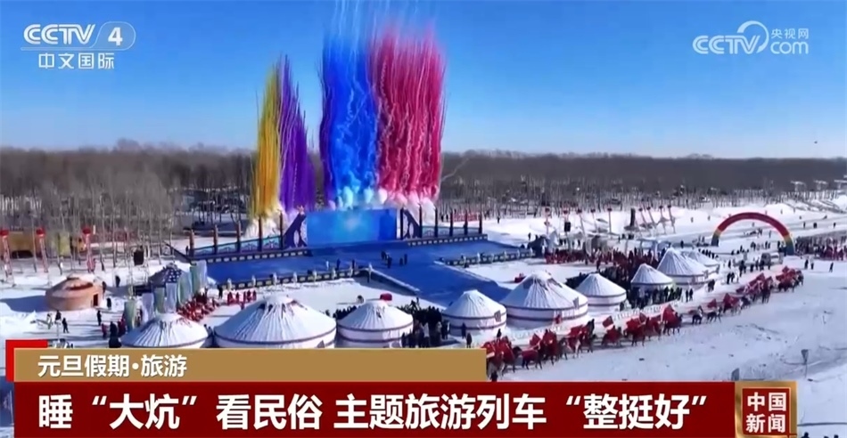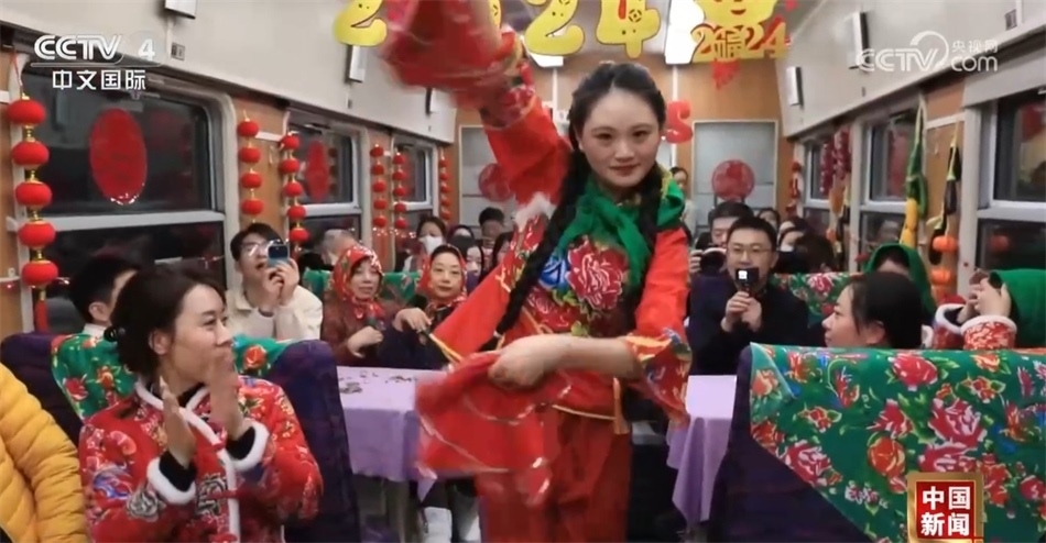 總臺央視記者 楊曜語:我即將登上的列車就是從哈爾濱開往漠河的國內(nèi)首個(gè)沉浸式東北民俗文化體驗(yàn)列車,坐過的人都說一上車就想盤腿兒了,我們趕緊來體驗(yàn)一下!一上車我就被濃濃的東北文化所感染到了,整個(gè)車廂都被東北大花的經(jīng)典配色裝飾著,再加上隨手就能品嘗到東北特色美食,坐在床鋪上就感覺一秒鐘“穿越”到農(nóng)家炕頭。