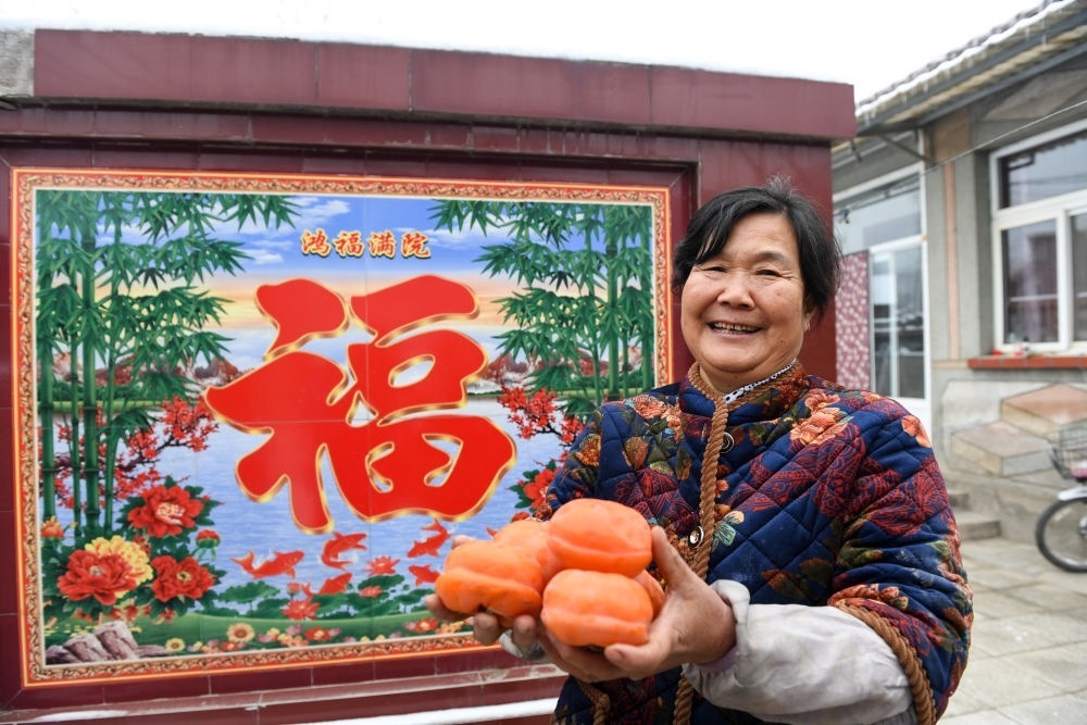 在北京市房山區(qū)佛子莊鄉(xiāng)陳家臺村,61歲的村民馬書金在修繕完畢的院子里展示不久前在山上摘得的柿子(12月12日攝)。新華社記者 鞠煥宗 攝