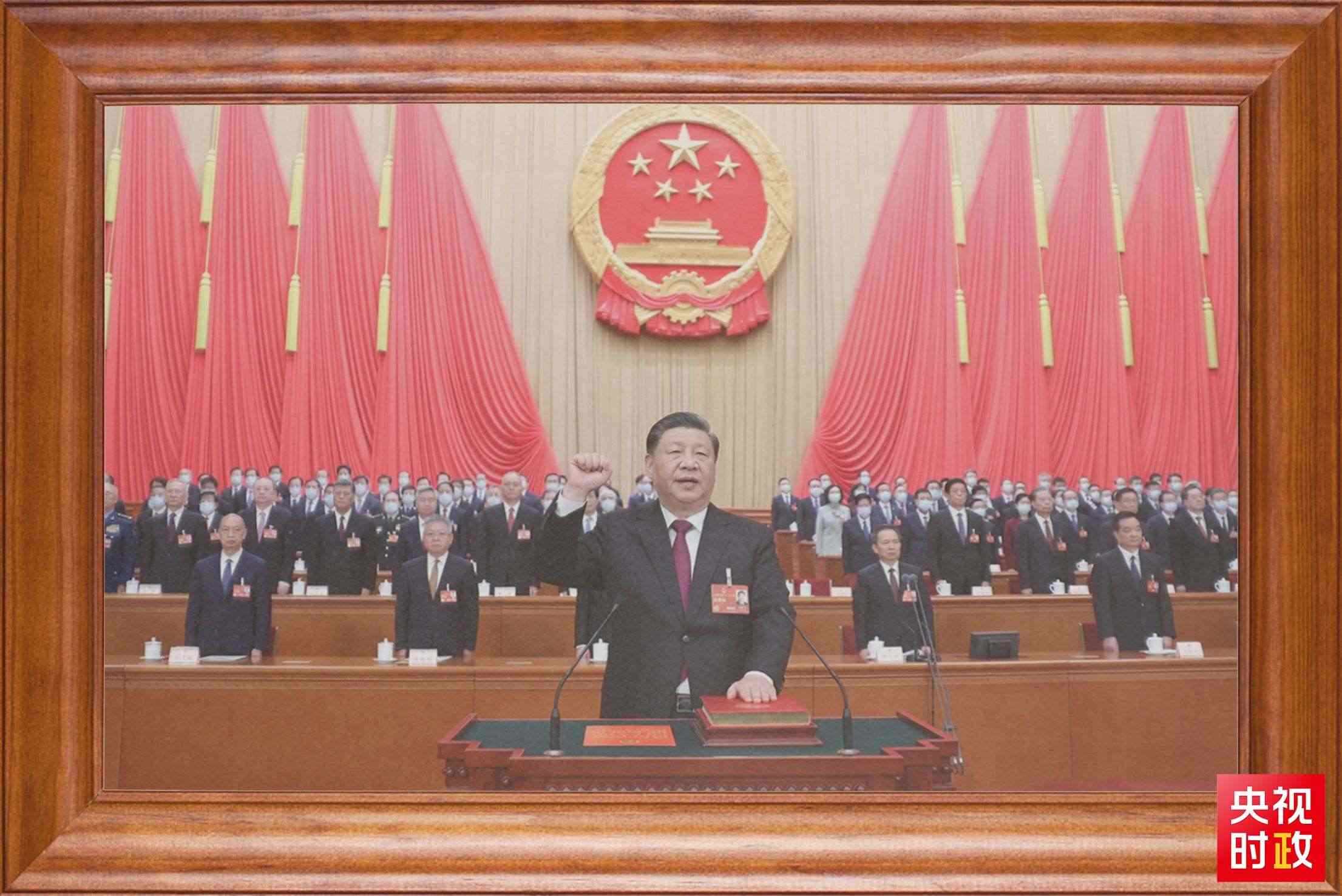 還有一張?zhí)貏e的照片。2023年3月10日,在北京人民大會堂,全票當(dāng)選國家主席、中央軍委主席的習(xí)近平,左手撫按《中華人民共和國憲法》,右手舉拳,面向近3000名全國人大代表,鄭重宣誓。