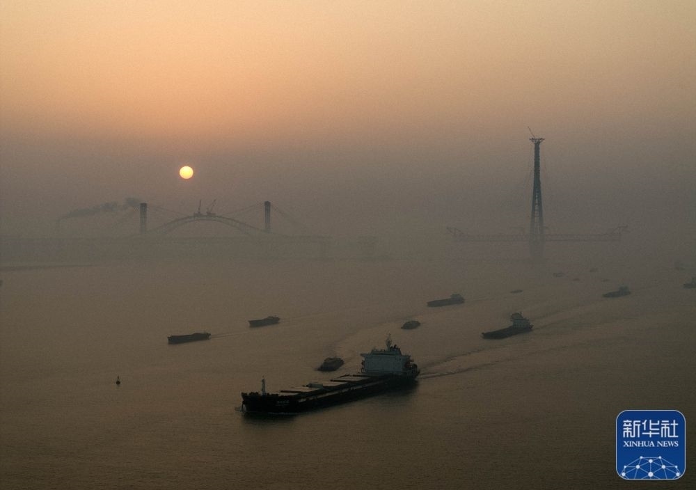 1月1日,船只在晨光中經過位于江蘇省泰興市的常泰長江大橋建設現(xiàn)場(1月1日攝,無人機照片)。新華社發(fā)(湯德宏 攝)