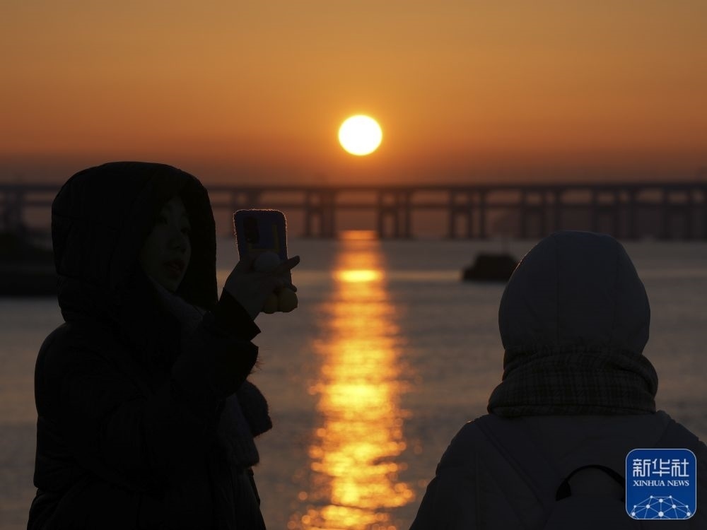 1月1日,人們在遼寧大連星海廣場拍攝海上日出。新華社記者 李鋼 攝