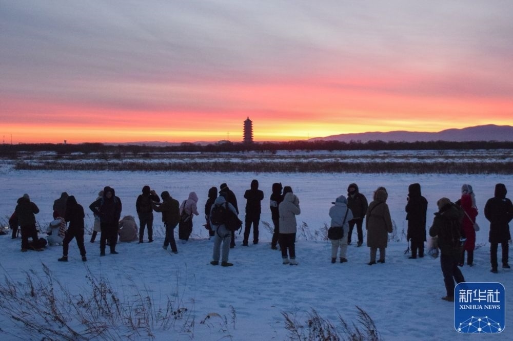 1月1日,游客在黑龍江省撫遠市黑瞎子島上看日出。新華社發(fā)(官長青 攝)