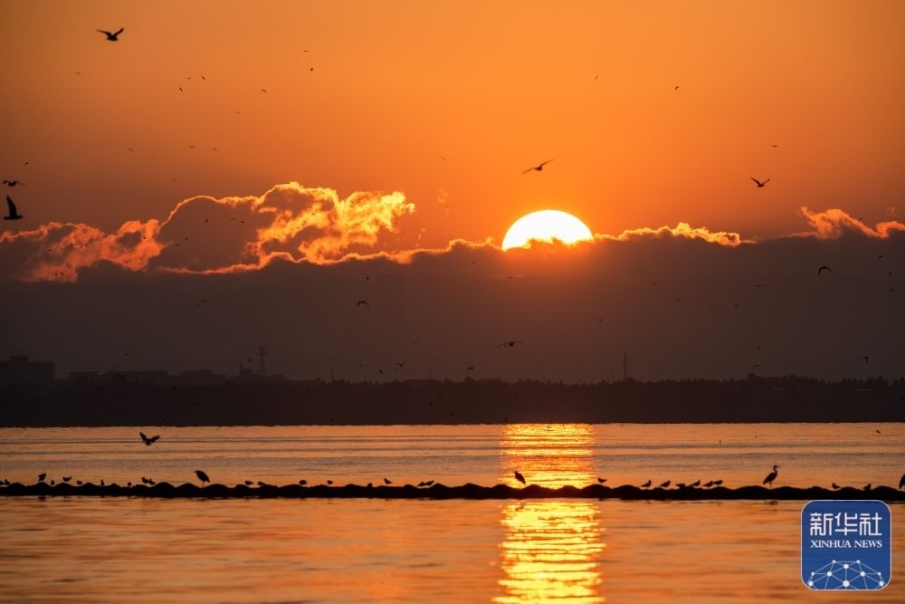 1月1日,在山東省臨沂市郯城縣,鳥兒迎著晨光飛翔。新華社發(fā)(張春雷 攝)
