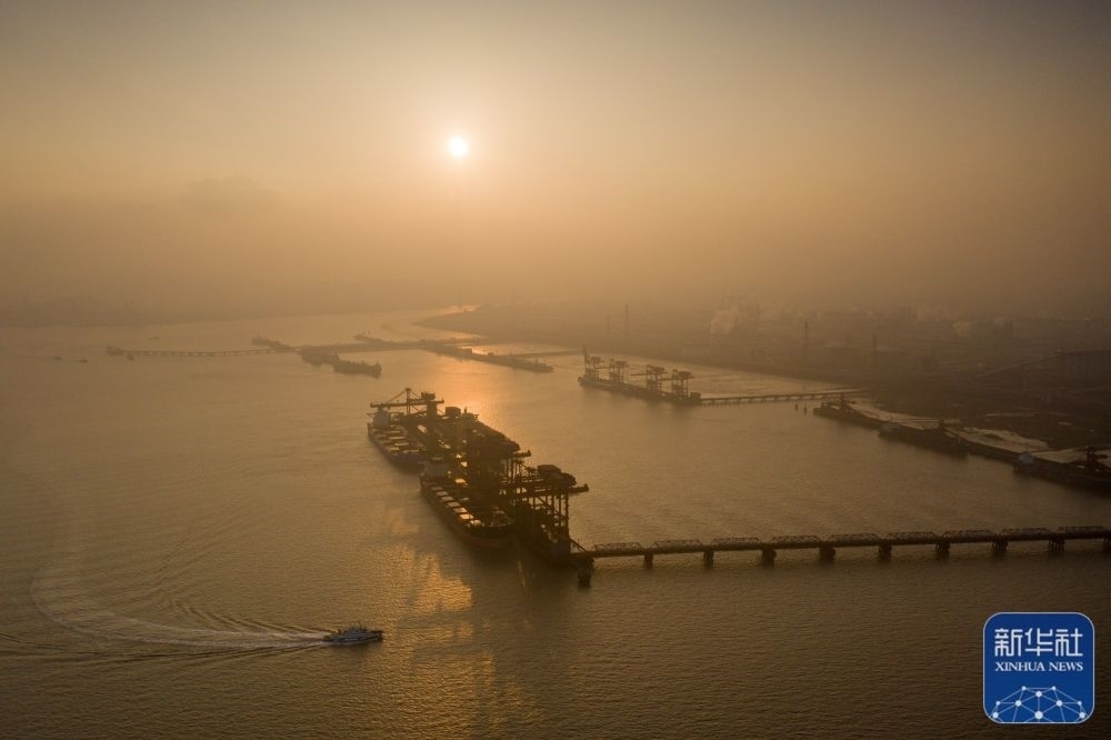 1月1日,在新年第一縷晨光里,浙江省寧波舟山港北侖港區(qū)礦石碼頭生產一派繁忙(無人機照片)。新華社發(fā)(蔣曉東 攝)