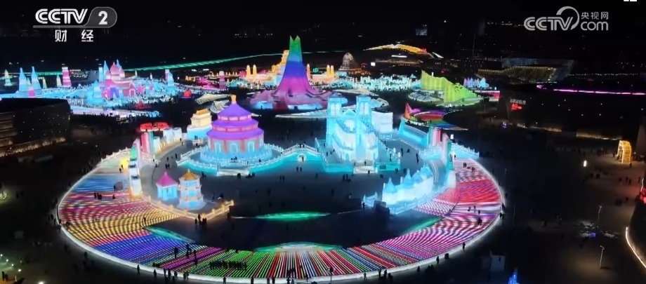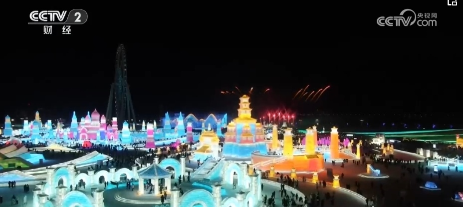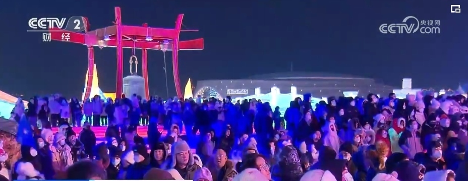 總臺(tái)央視記者 郭晉華:在這個(gè)冰雕玉砌的世界,一簇簇焰火映襯著流光溢彩的冰雕建筑群,帶著人們對(duì)新年的祈盼噴薄而出。哈爾濱冰雪大世界,雖然現(xiàn)在室外氣溫達(dá)到了零下20多度,但是大家冰雪跨年的熱情卻是點(diǎn)燃了全場,來自全國各地的游客在這場狂歡中一起迎接新年的到來。