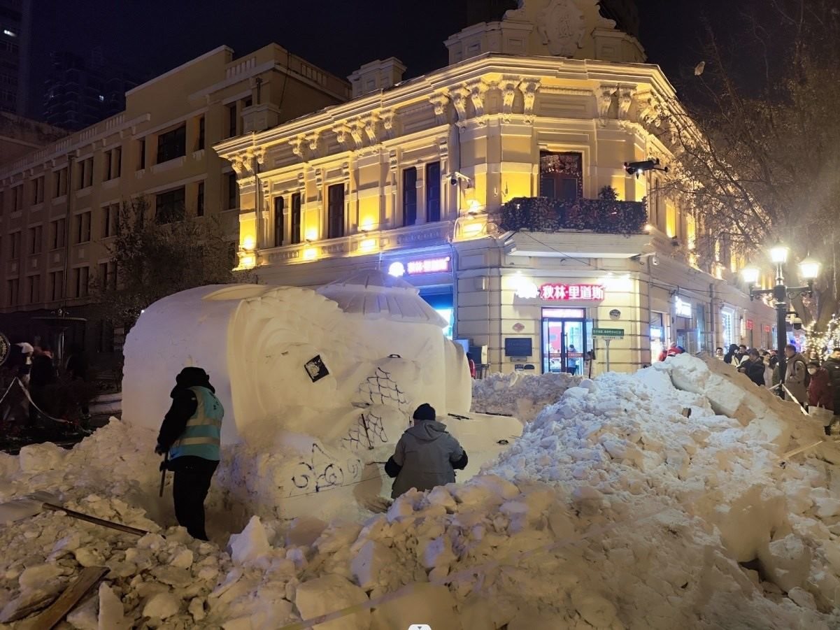 元旦假期的中央大街,鄂倫春族人牽馴鹿巡游,馬迭爾冰棍攤位前排起了隊,天南海北的游客在這里感受寒冷徹骨與熱氣騰騰的交織。55歲的臧洪洲,正與其他幾位雕刻師傅一起打磨一座名叫“五谷豐登 年年有魚”的雪雕作品,夜幕降臨,留給他們的時間不多了。