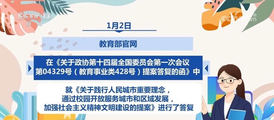 1月2日,教育部官網(wǎng)在《關(guān)于政協(xié)第十四屆全國(guó)委員會(huì)第一次會(huì)議第04329號(hào)(教育事業(yè)類428號(hào))提案答復(fù)的函》中,就《關(guān)于踐行人民城市重要理念,通過(guò)校園開(kāi)放服務(wù)城市和區(qū)域發(fā)展,加強(qiáng)社會(huì)主義精神文明建設(shè)的提案》進(jìn)行了答復(fù)。