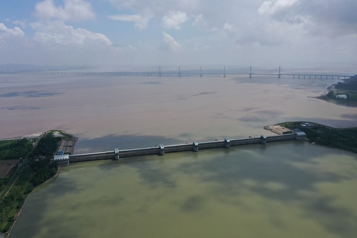 曹娥江大閘是我國強(qiáng)涌潮河口地區(qū)第一大閘,浙東水資源配置重要樞紐工程(2023年8月4日攝,無人機(jī)照片)。新華社記者 黃宗治 攝