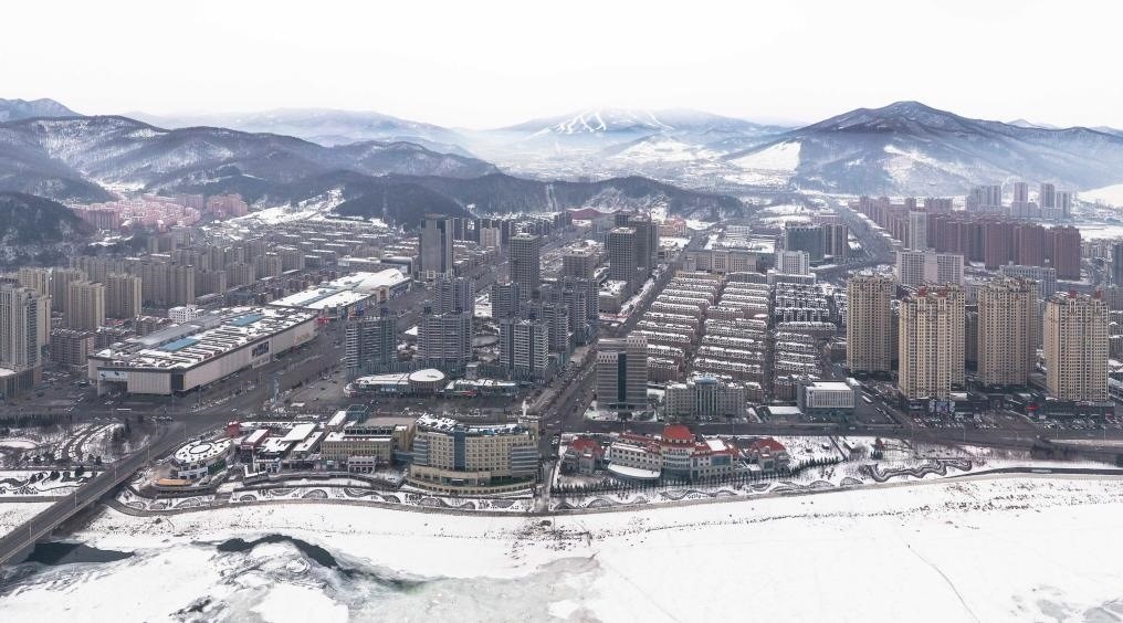 吉林省通化市城區(qū)和遠(yuǎn)處的萬(wàn)峰通化滑雪度假區(qū)(無(wú)人機(jī)照片)。新華社記者 許暢 攝