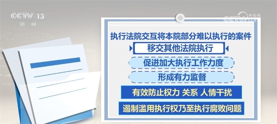 2023年10月,最高人民法院部署開展交叉執(zhí)行工作試點。據(jù)介紹,交叉執(zhí)行是指通過指定、提級執(zhí)行,執(zhí)行法院交互將本院部分難以執(zhí)行的案件移交其他法院執(zhí)行,促進加大執(zhí)行工作力度,并形成有力監(jiān)督,有效防止權(quán)力、關(guān)系、人情干擾,遏制濫用執(zhí)行權(quán)乃至執(zhí)行腐敗問題。