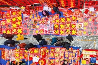 春節(jié)臨近,各地張燈結(jié)彩。人們逛花市、賞花燈、置辦年貨,年味漸濃。這是無人機(jī)拍攝的1月22日山東省青島市李村大集,人們?cè)谶x購春節(jié)飾品。