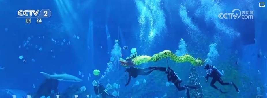 在鄭州一家海洋主題公園,4名潛水員化身“舞龍高手”,伴隨著他們的一招一式,一條金龍?jiān)谒序v挪起伏,向人們傳遞萬物生輝的新春祝福。