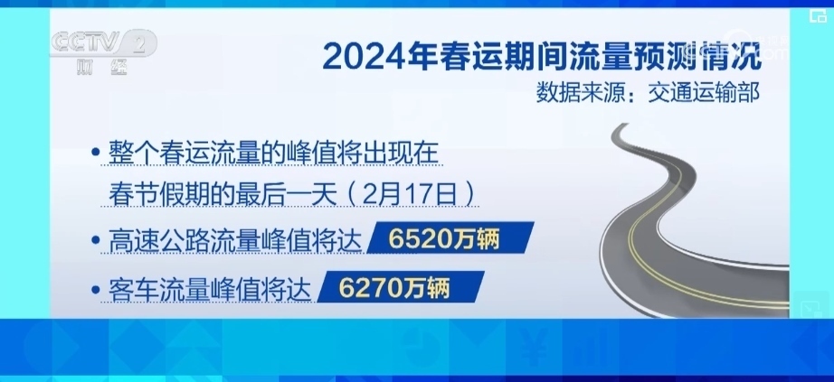 交通運(yùn)輸部預(yù)計(jì),2024年春運(yùn)期間,全國公路網(wǎng)日均流量將達(dá)3720萬輛,比2023年同期增長7.5%。整個(gè)春運(yùn)流量的峰值將出現(xiàn)在春節(jié)假期的最后一天,也就是2月17日,高速公路流量峰值將達(dá)6520萬輛,客車流量峰值將達(dá)6270萬輛。