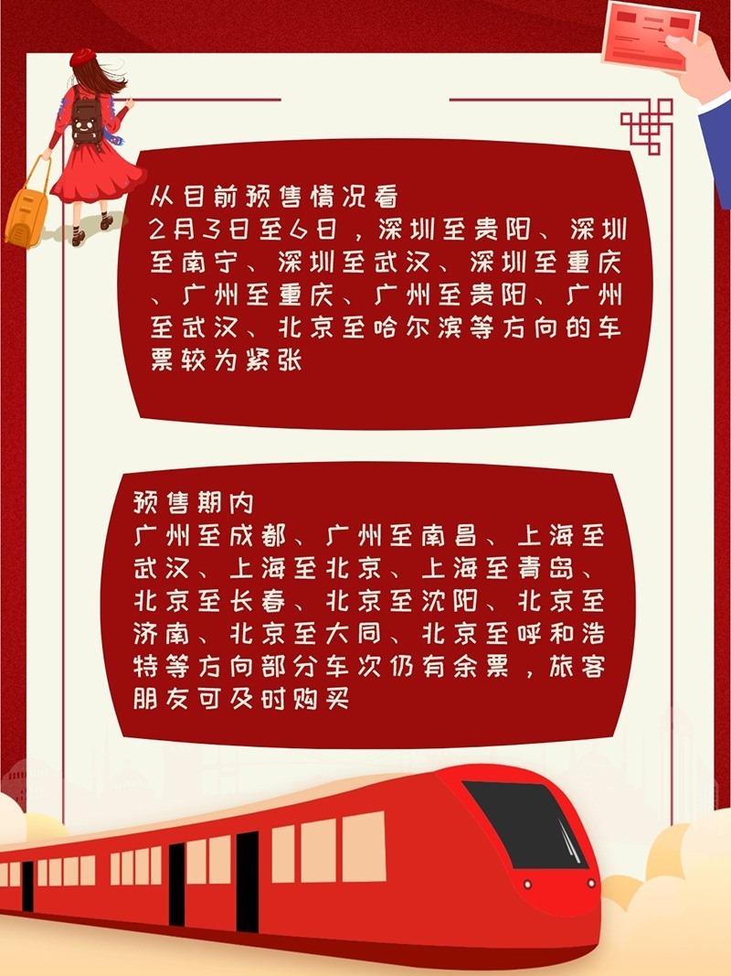 從目前預(yù)售情況看,2月3日至6日,深圳至貴陽(yáng)、深圳至南寧、深圳至武漢、深圳至重慶、廣州至重慶、廣州至貴陽(yáng)、廣州至武漢、北京至哈爾濱等方向的車票較為緊張。預(yù)售期內(nèi),廣州至成都、廣州至南昌、上海至武漢、上海至北京、上海至青島、北京至長(zhǎng)春、北京至沈陽(yáng)、北京至濟(jì)南、北京至大同、北京至呼和浩特等方向部分車次仍有余票,旅客朋友可及時(shí)購(gòu)買。