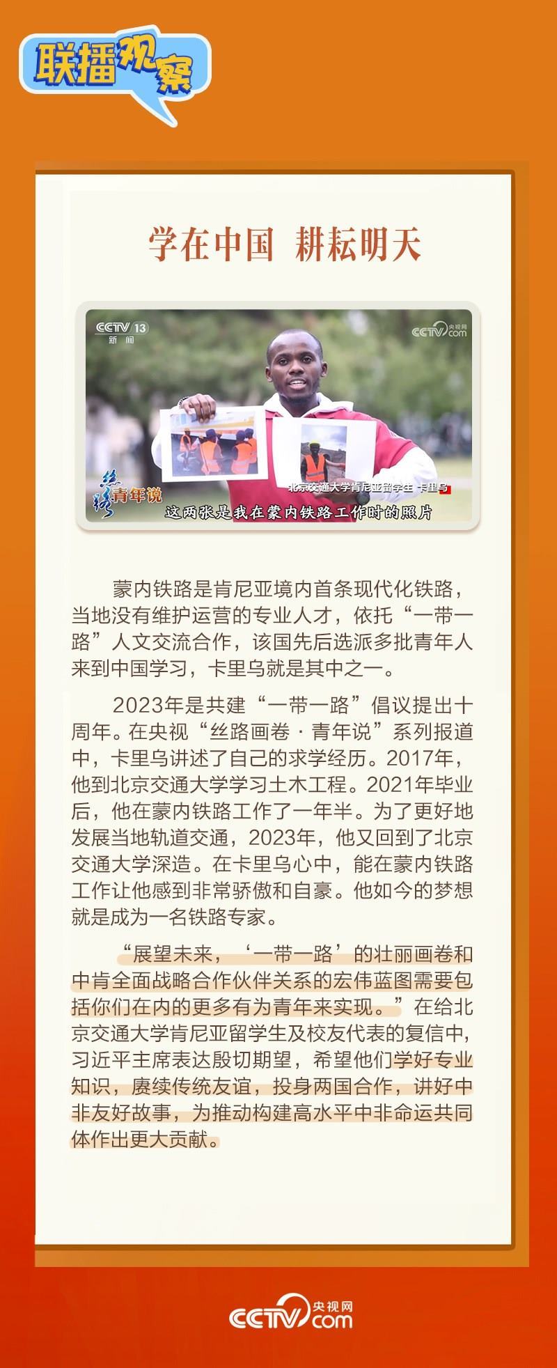 日前,北京交通大學(xué)肯尼亞留學(xué)生及校友代表致信習(xí)近平主席,表示非常高興來到中國學(xué)習(xí)鐵路運營管理知識。1月17日,習(xí)近平主席復(fù)信表達欣慰和喜悅之情,“蒙內(nèi)鐵路是中肯共建‘一帶一路’旗艦項目和成功典范。我高興地看到,你們因這條‘幸福路’與中國結(jié)緣……”