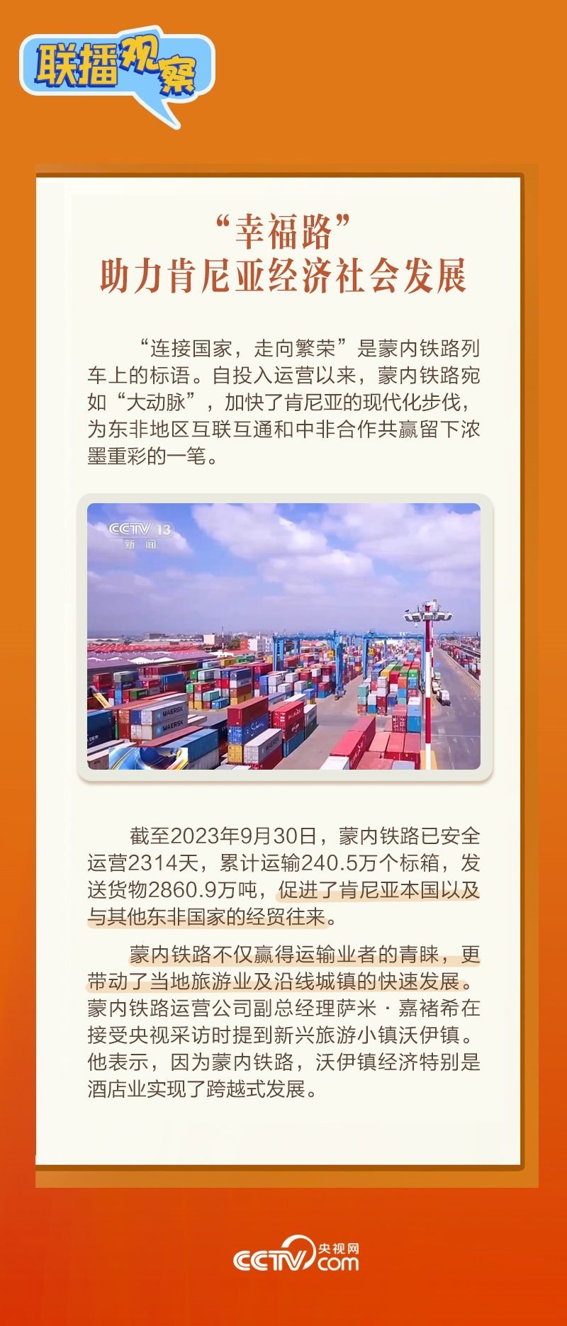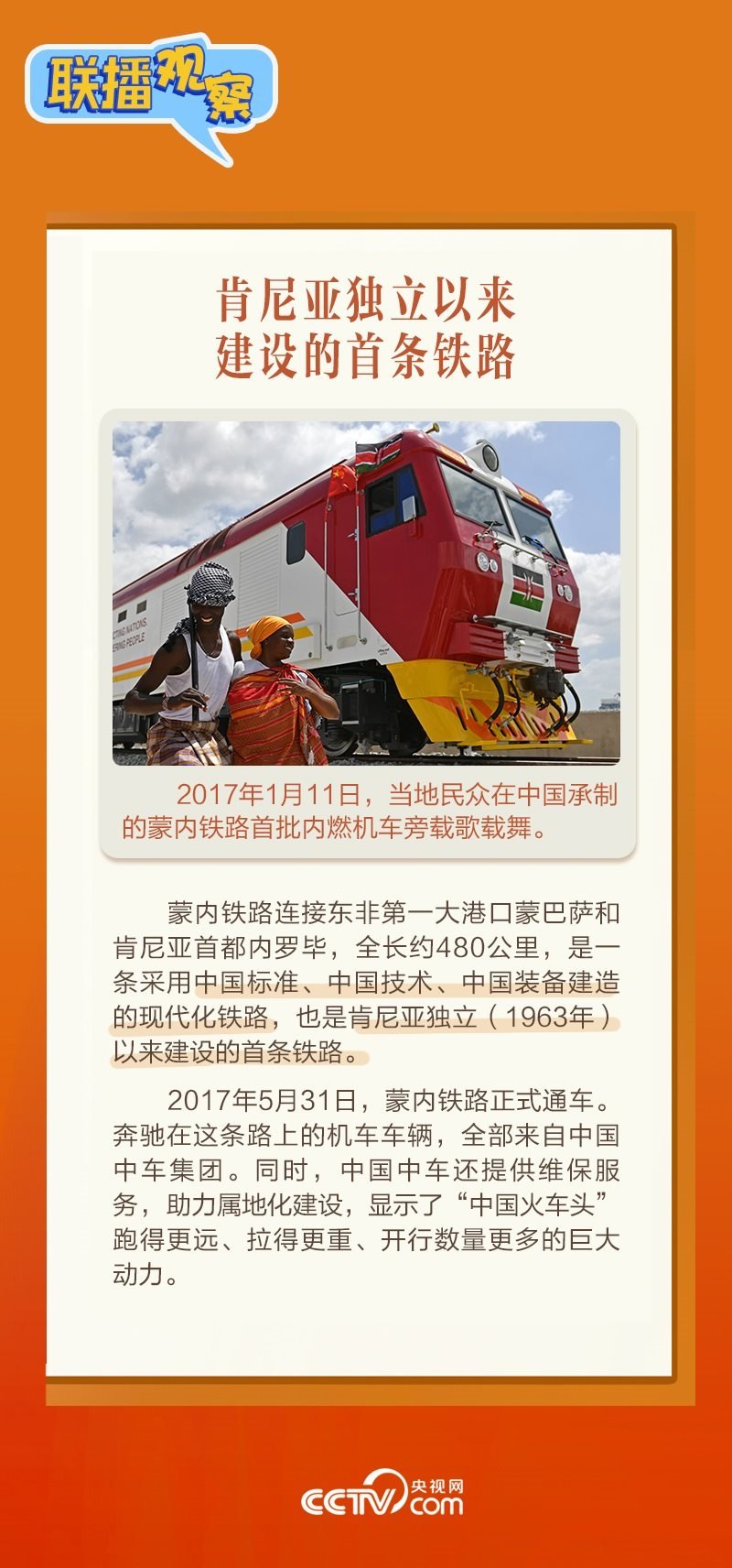此前,習(xí)主席在外事活動中多次提及蒙內(nèi)鐵路,《新聞聯(lián)播》也持續(xù)關(guān)注這條路的建設(shè)及開通后的運營情況。這條“幸福路”有何特別之處,習(xí)主席為何頻頻提及?它的建成通車給當(dāng)?shù)貛砟男┳兓??《?lián)播觀察》邀您一同了解。