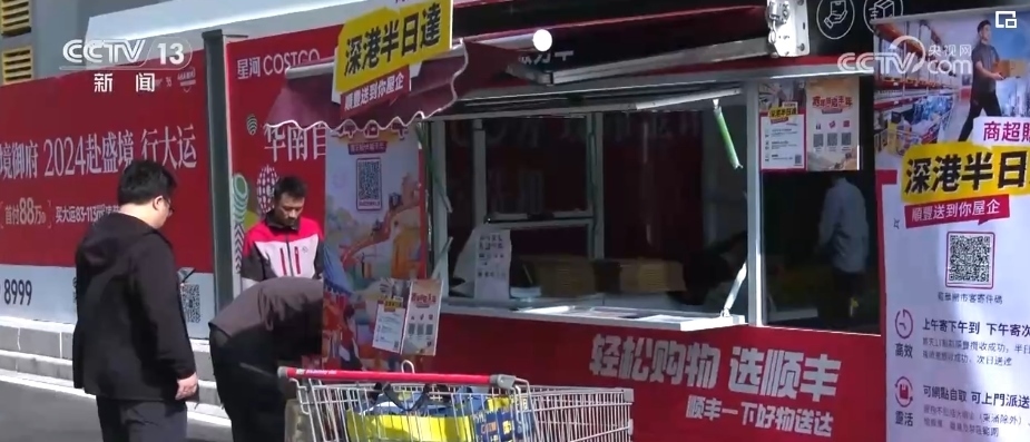 在深圳的這家超市,從出口處向外走兩步,就是快遞公司專門在現(xiàn)場設(shè)置的寄送服務(wù)點(diǎn)。大包、小包的商品從剛剛推出的購物車?yán)锉魂懤m(xù)裝進(jìn)打包箱,即發(fā)即走。港澳消費(fèi)者大概前腳剛到家,后腳就能收到貨。