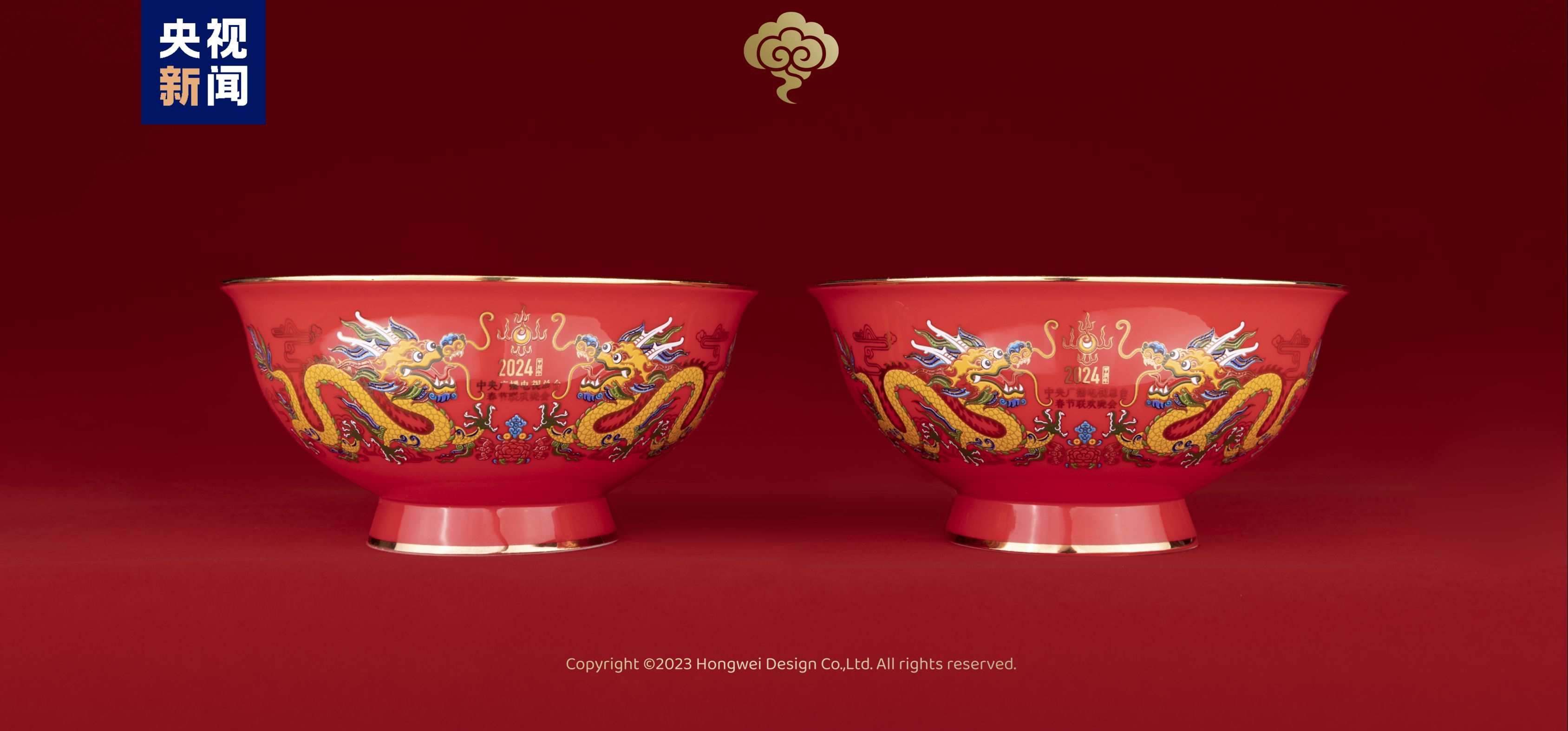 總臺(tái)文創(chuàng)的龍碗主畫面取自中國(guó)民間吉祥裝飾圖案“雙龍戲珠”,采用對(duì)稱型構(gòu)圖,寓意富貴吉祥,幸福安康。龍碗色彩鮮艷明快,烘托出民間新年的喜慶氛圍。