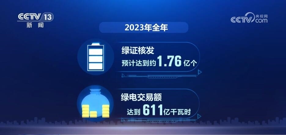 全覆蓋,是2023年我國(guó)綠電消費(fèi)的一大關(guān)鍵詞。通過(guò)給已建檔立卡的可再生能源發(fā)電項(xiàng)目全部核發(fā)綠證,我國(guó)成為全球最大的綠證供應(yīng)市場(chǎng)。全年綠證核發(fā)預(yù)計(jì)達(dá)到約1.76億個(gè),綠電交易額達(dá)到611億千瓦時(shí),分別是2022年的7.8倍和10.5倍。