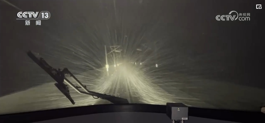 從零時15分開始到清晨4點多,熱滑除冰車分別駛過鄭州東、黃河大橋、新鄉(xiāng)和南樂,車窗外白雪皚皚,視線和視野都受到限制。一路上,雨滴和雪粒不斷敲打著車窗,從接觸網(wǎng)上掉落的冰碴,不斷落在車頂上砰砰作響,銅基受電弓在結(jié)冰的接觸網(wǎng)上拉出長長的電弧,噼里啪啦電光四射。