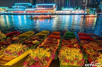 2月5日,廣東佛山,春節(jié)臨近,佛山最大的水上花市在里水鎮(zhèn)開幕。其中水上渡船、水上燈會等項目融入了非遺元素,展示嶺南水鄉(xiāng)風情,營造濃濃的年味。