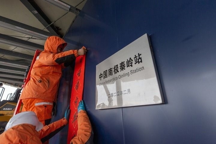 2024年2月9日,工作人員在中國(guó)南極秦嶺站貼對(duì)聯(lián)。新華社記者 周圓 攝