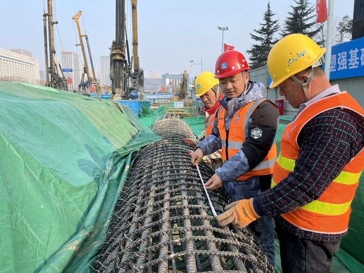 2024年2月9日,在中建八局承建的濟(jì)南軌道交通7號(hào)線一期工程的龍奧大廈站施工現(xiàn)場(chǎng),質(zhì)量工程師劉學(xué)(中)在檢查鋼筋籠焊接質(zhì)量。新華社發(fā)