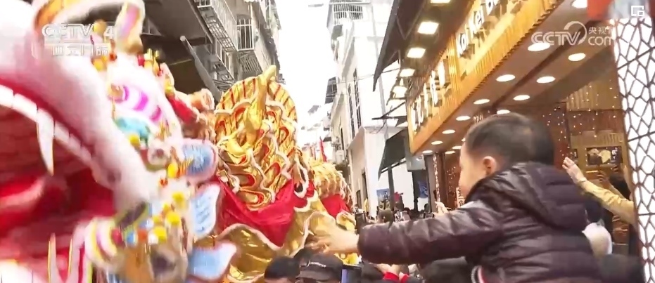 農(nóng)歷春節(jié)大年初一,澳門特區(qū)政府旅游局舉辦“歡樂春節(jié)——2024年龍騰舞躍賀新春”社區(qū)巡演活動(dòng)。238米長的大金龍和18頭醒獅,穿越澳門大街小巷和主要景區(qū),市民和游客紛紛伸手觸摸金龍和醒獅,迎春納福。