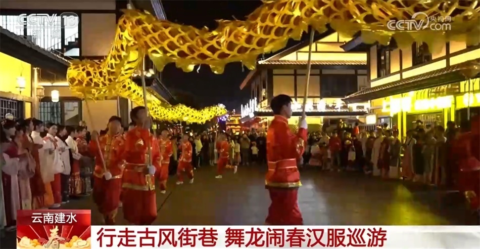 在云南紅河州建水縣紫陶里漢唐街區(qū),一場(chǎng)舞龍鬧春漢服巡游活動(dòng)拉開了序幕。舞龍隊(duì)伍一路閃轉(zhuǎn)騰挪,一條黃色長(zhǎng)龍奮力舞動(dòng),忽高忽低,飄忽飛逸。身著華美漢服的姑娘行走在古風(fēng)街巷間,一種古樸幽遠(yuǎn)的韻味撲面而來。市民與游客在感受建水年味的同時(shí),也體驗(yàn)到中華傳統(tǒng)文化之美。
