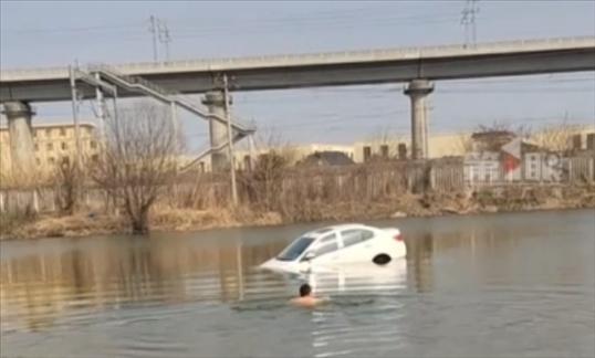 ·江蘇南通一釣友忘拉手剎,汽車(chē)滑下臺(tái)階墜入魚(yú)塘。
