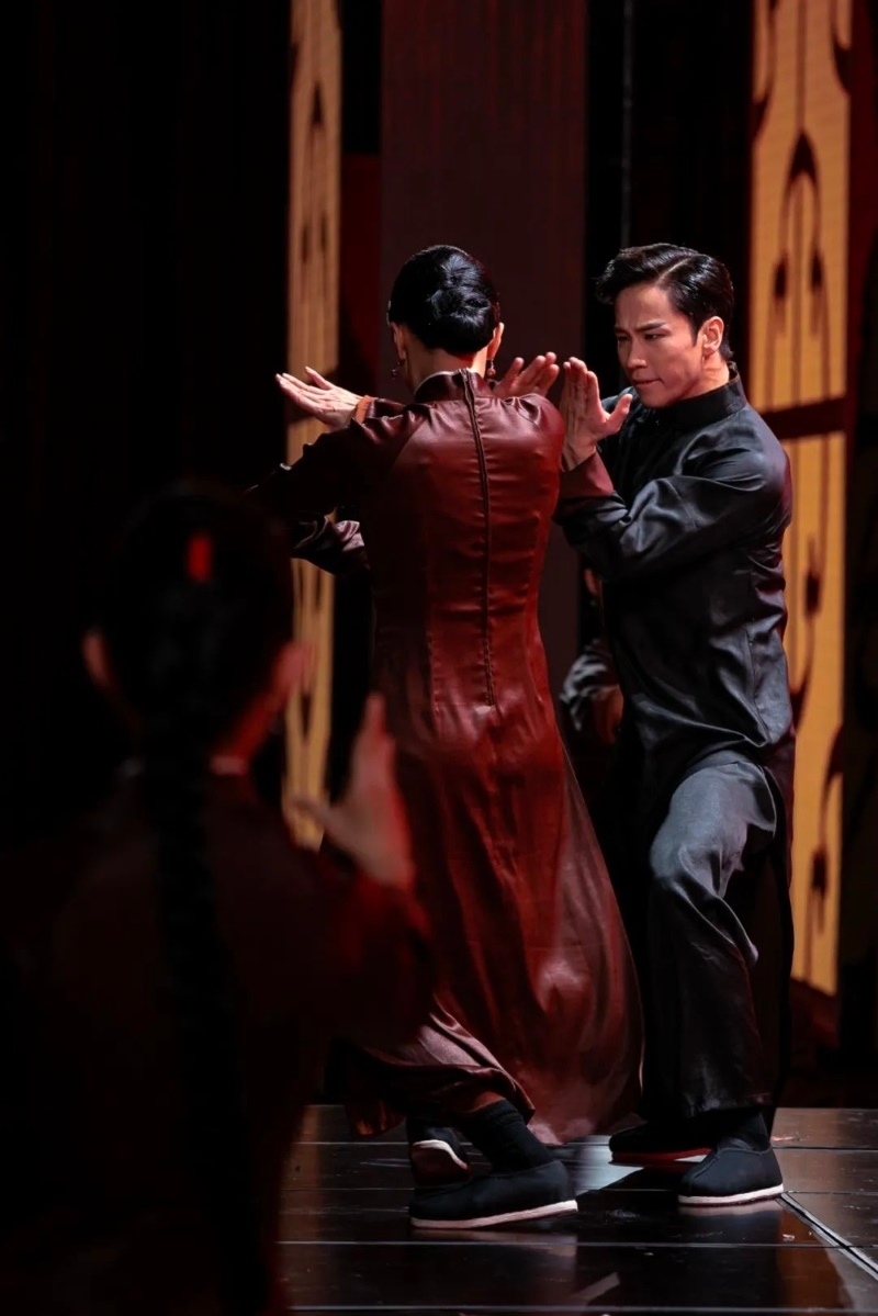 密集的鼓點(diǎn)聲中,一道巨大的人像剪影出現(xiàn)在黃褐色的巨幕上,馬步牢固、拳拳帶風(fēng)。目光正隨著人影挪不開眼,只見一個騰空飛旋過后,“葉問”同步從屏后翻旋而出,來到臺前。那人那影,一時間讓人恍惚,什么叫“形影相隨”,什么叫“弄影團(tuán)風(fēng)”,如今就在眼前!