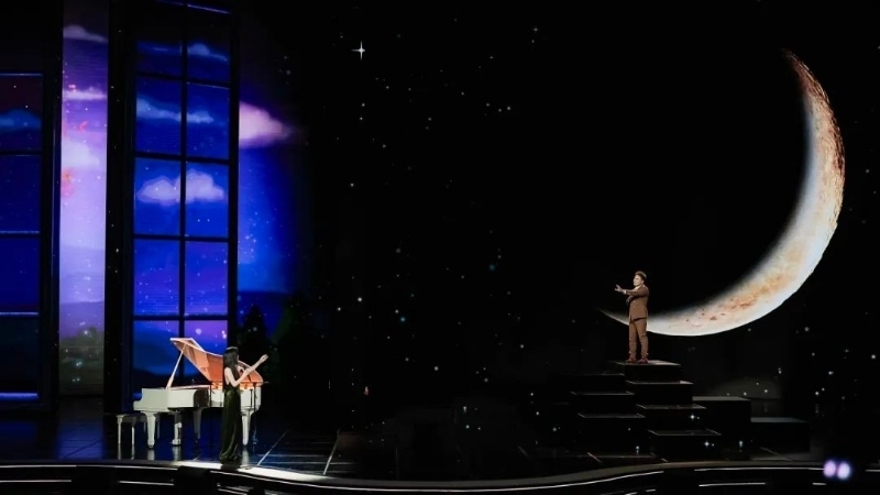歌詞迅速修改到位,但舞臺的呈現(xiàn)成了讓人反復(fù)琢磨的問題。如何表現(xiàn)“想見卻無法相見”的感覺?如何營造恰到好處的絲絲愁緒?從初次彩排時用秋千承載思念,到二排時改用燈光打造“兩個空間”,幾番嘗試總讓人感覺“還差點(diǎn)兒味道”。最后臺長提議,用“剪影”去暈染思念的情緒,可以考慮用蘇軾的“人有悲歡離合,月有陰晴圓缺”的意境,以月亮為背景。這一下子打開了大家的思路。