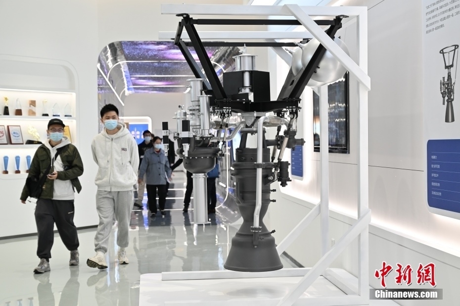 中科空天飛行科技產(chǎn)業(yè)化基地在廣州南沙投產(chǎn)。圖為中科空天飛行科技產(chǎn)業(yè)化基地展廳展示的液體發(fā)動機模型吸引參觀者。 中新社記者 陳楚紅 攝