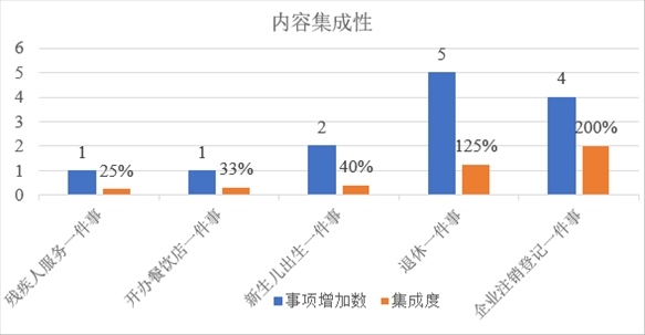 從內(nèi)容集成度看,5項相關“一件事”的事項集成比例均有不同程度提升。“殘疾人服務一件事”增加1個事項,集成度提升25%?!伴_辦餐飲店一件事”增加1個事項,集成度提升33%?!靶律鷥撼錾患隆痹黾?個事項,集成度提升40%?!巴诵菀患隆痹黾?個事項,集成度提升125%?!捌髽I(yè)注銷登記一件事”增加4個事項,集成度提升200%。